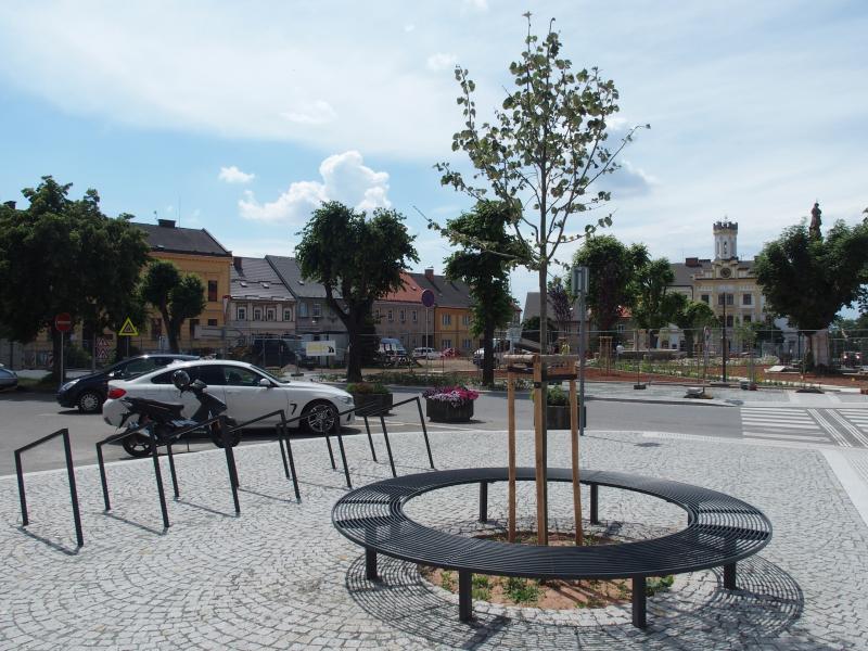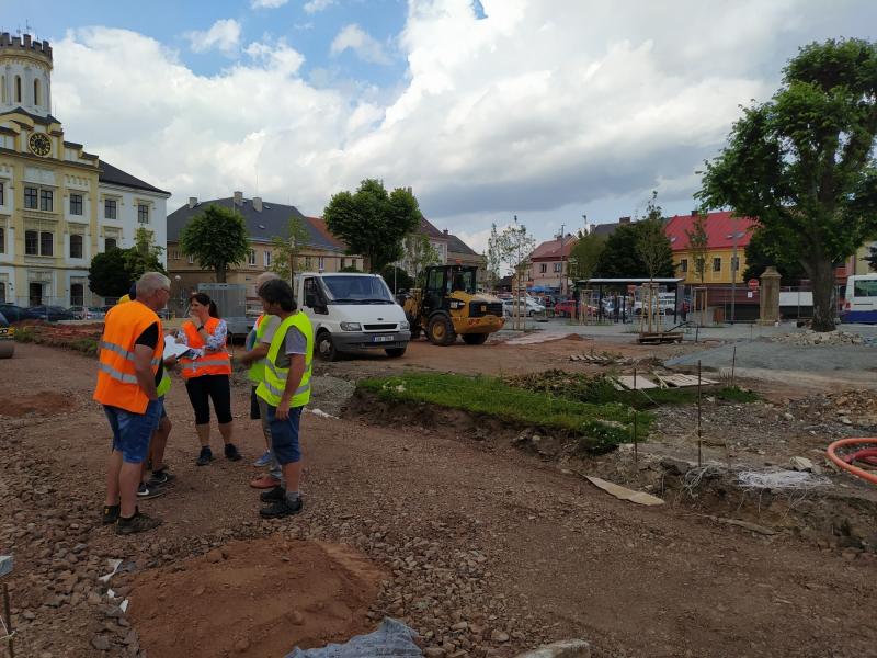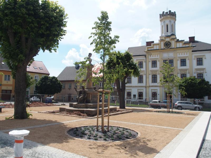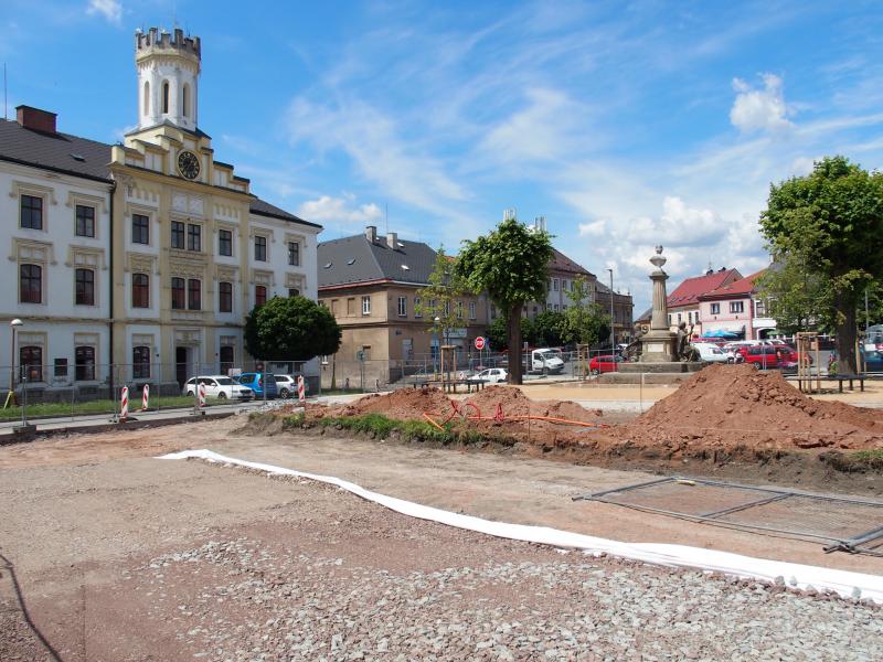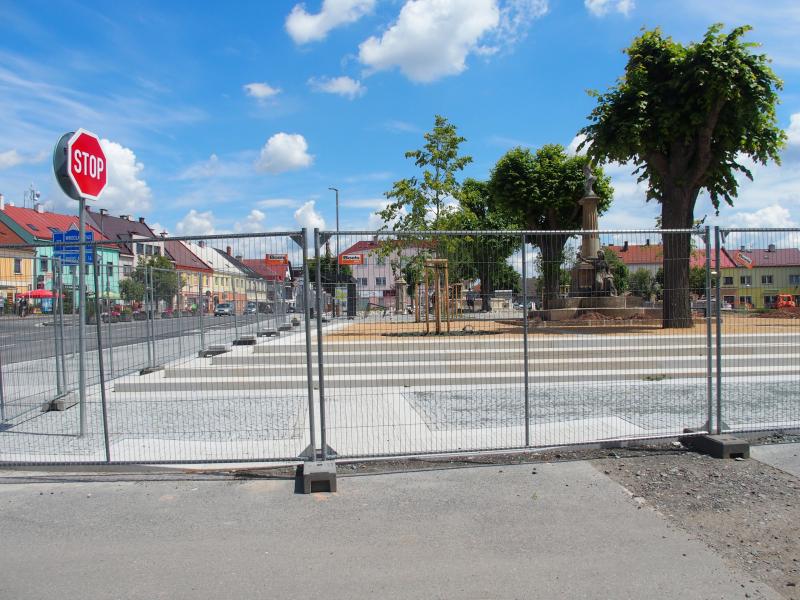 Práce se nezastavily ani o prázdninách. Hory dlažebních kostek začaly postupně mizet. Dělníci dokončili okolí pomníku Boženy Němcové.