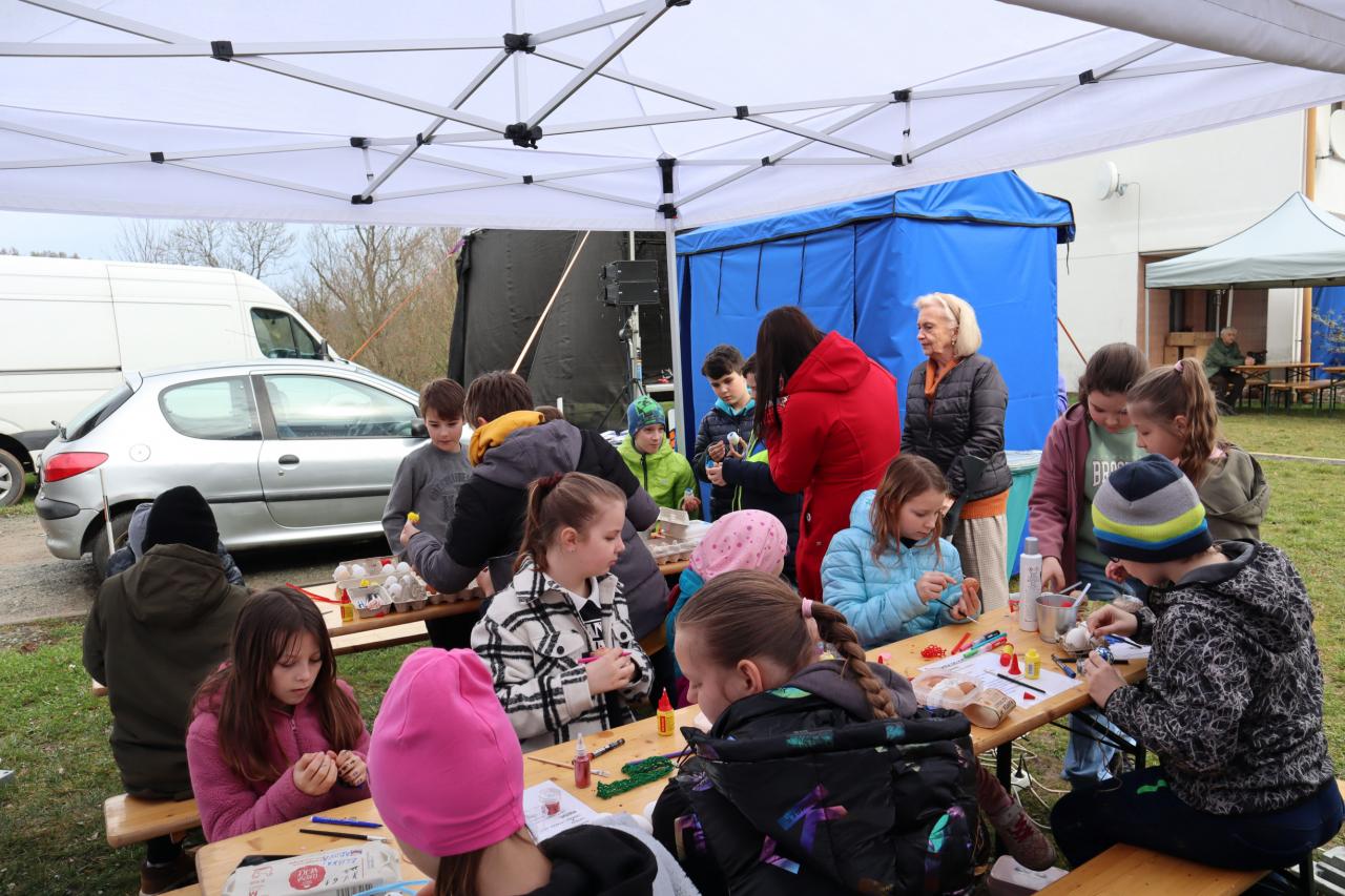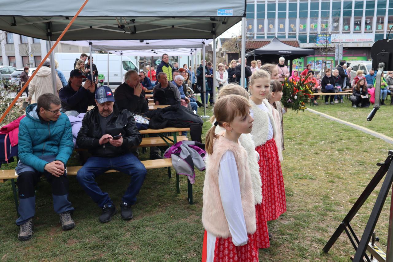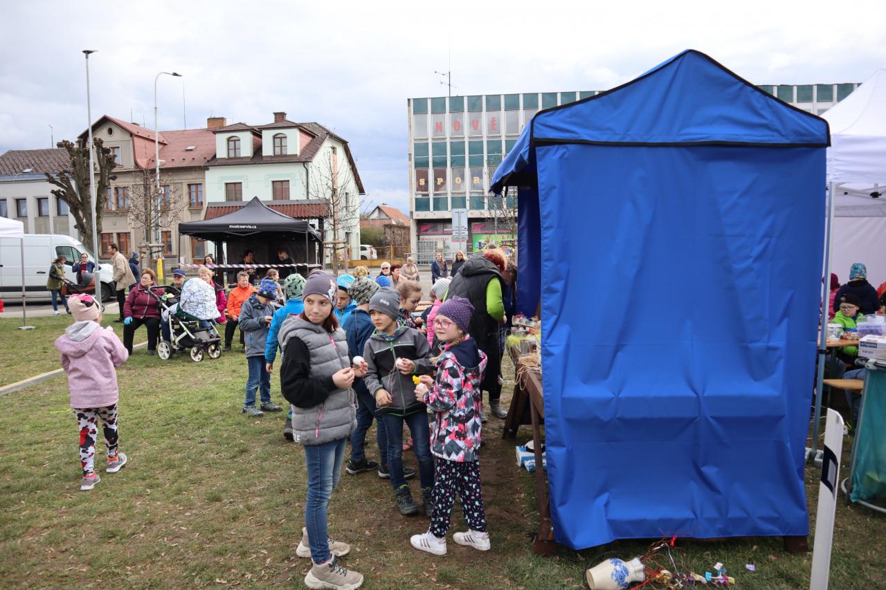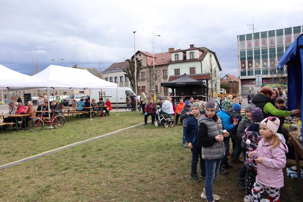 Fotografie z akce Kraslice pro náměstí v České Skalici. Děti ze školky, školy a školní družiny malovaly kraslice. Výrobu velikonočních vajíček si zkusili i návštěvníci z Polska. Děti ze Základní umělecké školy Česká Skalice, soubor Viktorka, hudební skupiny Trosky z Mečova a Pěnice ze České Skalice