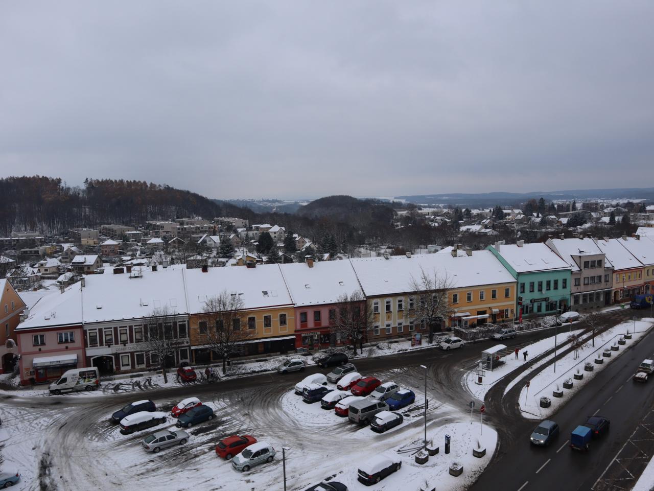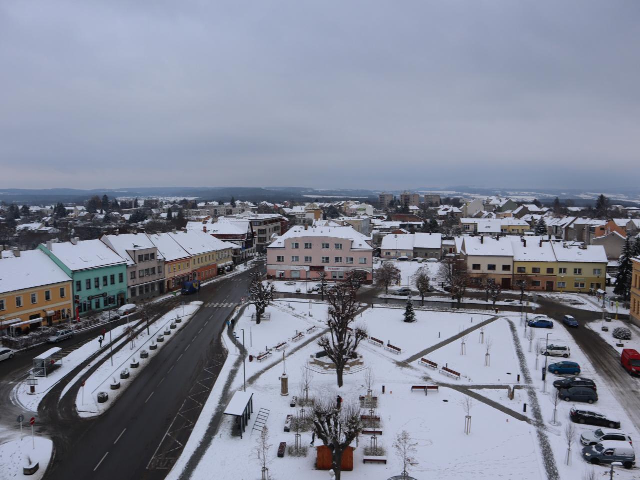 Pohled z věže staré radnice na severní část Husova náměstí a směrem k Vinici