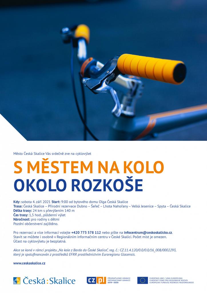 Již v 9 hodin můžete vyrazit na cyklistický výlet se startem od bytového domu Olga, odkud pojedete přes Dubno, Šeřeč, Lhotu u Nahořan, Velkou Jesenici a Spytu zpět do České Skalice. Délka trasy 24 km. Pozdní občerstvení zajištěno. Účast na výletu je bezplatná.