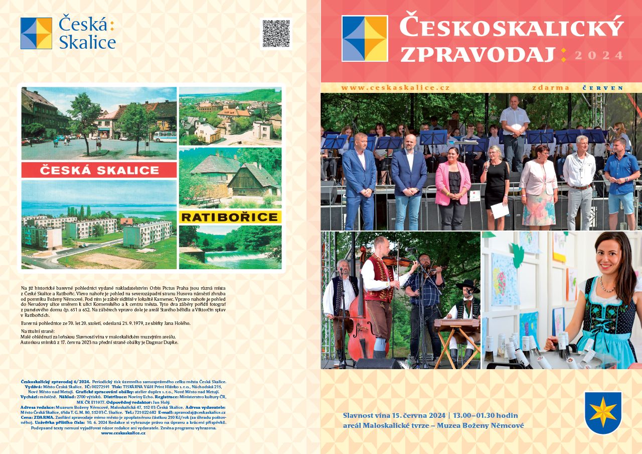 Vyšel červnový Českoskalický zpravodaj. Datum vydání elektronické verze: 30. 5. 2024 Datum vydání tištěné verze: 30. 5. 2024 Termín distribuce tištěné verze: do 5. 6. 2024 (včetně)
