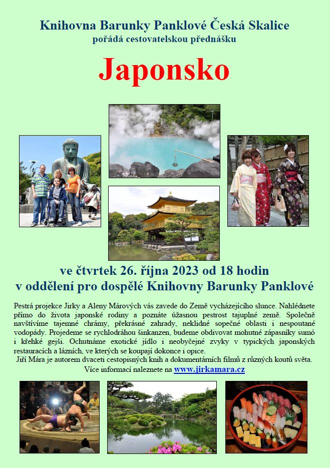 Připomínáme cestopisnou přednášku Jirky a Aleny Márových – Japonsko, která se koná v knihovně Barunky Panklové ve čtvrtek 26. října 2023 od 18 hodin.