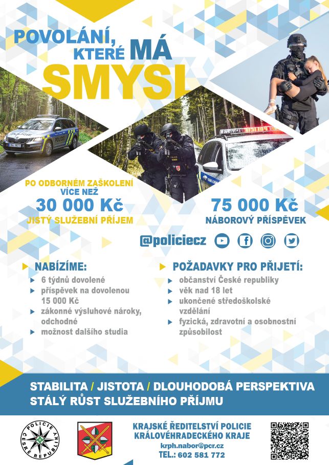 Hledáme muže i ženy starší 18 let se smyslem pro zodpovědnou a smysluplnou práci, při které budou chránit život a zdraví občanů České republiky a jejich majetek. Umíte se dobře a rychle rozhodnout? Jste zodpovědní? Chcete pomáhat ostatním? Rádi sportujete? Jste iniciativní při plnění svěřených úkolů? Máte pozitivní přístup k sebevzdělávání? Nejsou vám cizí slova – čest, odvaha, spravedlnost. Potom hledáme právě Vás a těšíme se, že rozšíříte naše řady a stanete se příslušníky Policie České republiky.
