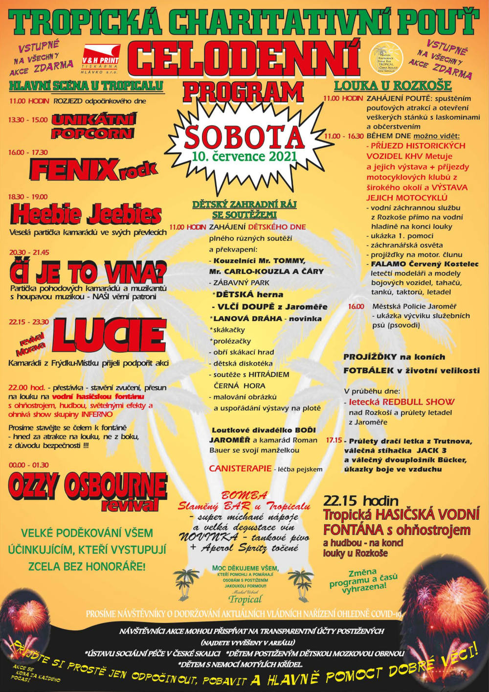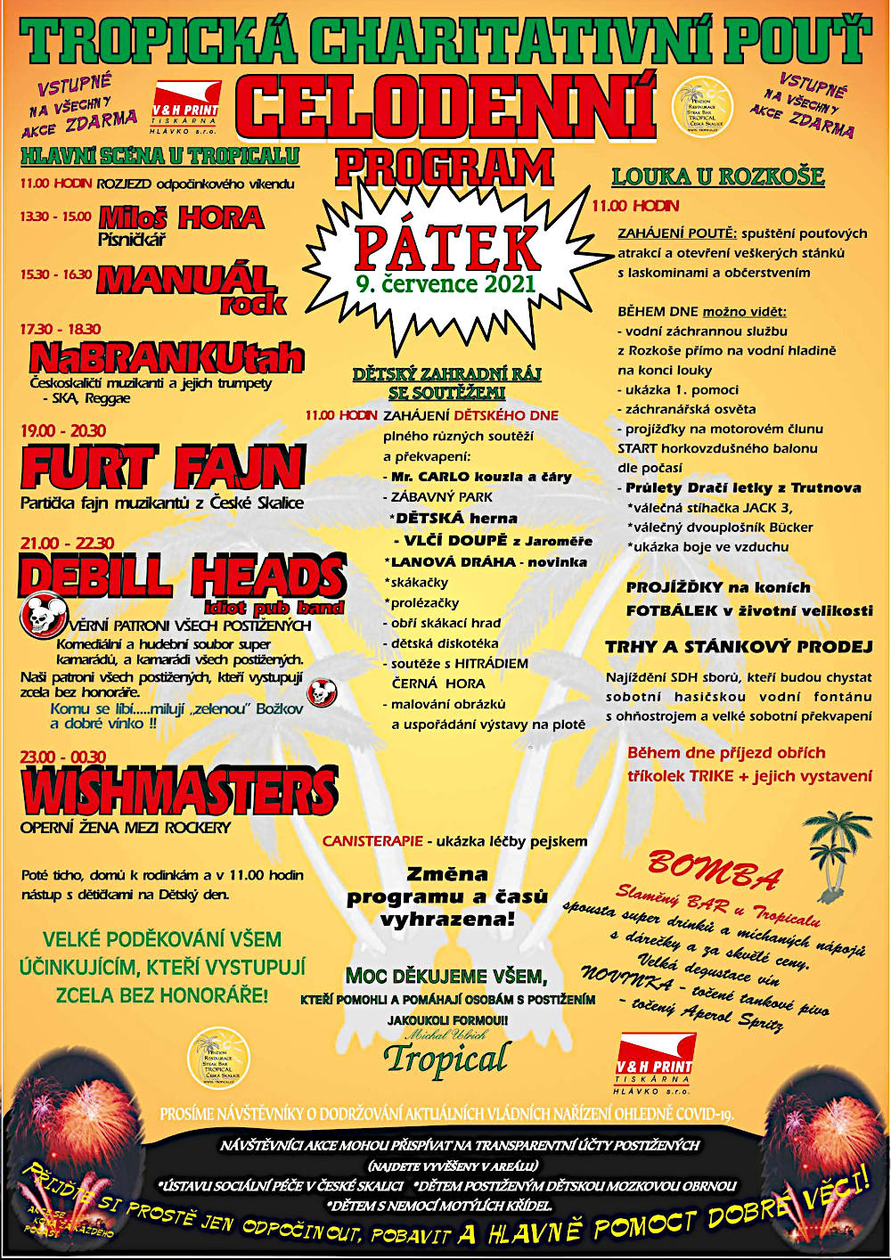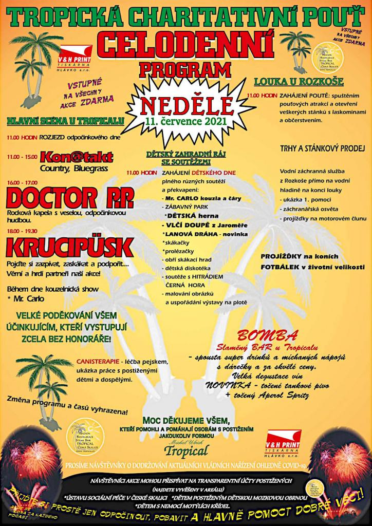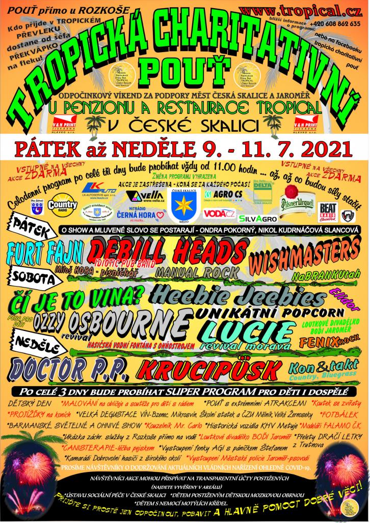 Již 15. ročník této charitativní akce je připraven a naplánován, akorát není jasné, jaká budou platit epidemiologická pravidla! Pořadatelé se budou snažit pouť uspořádat podle vládních nařízení. Celodenní odpočinkový program bude probíhat vždy od 11 hodin až do časných ranních hodin, co budou síly stačit. Pouťové atrakce a stánky s občerstvením. Od pátku do neděle bude hrát živá muzika. Program pro děti i dospělé po celé tři dny. V pátek zahrají a zazpívají Debill Heads, Wishmasters, Furt Fajn, Manual, Nabran Kutah a písničkář Miloš Hora. V sobotu bude hrát Heebie Jeebies, Lucie Revival Morava, Ozzy Osbourne Revival, Elidor, Fénix rock a Unikátní popcorn. Program doplní pěna pro děti, loutkové divadélko Boďi Jaroměř a hasičská vodní fontána s ohňostrojem. V neděli bude hrát Doctor P. P., Krucipüsk a Kon&Takt. Vystoupení a prezentace modelářů, auto a moto veteránů, letecká show, divadélka pro děti. Akce je zastřešena, koná se za každého počasí. Přijďte si prostě jen odpočinout, pobavit a pomoct dobré věci. Dobrovolné vstupné bude věnováno Ústavu sociální péče v České Skalici a dětem postiženým dětskou mozkovou obrnou.