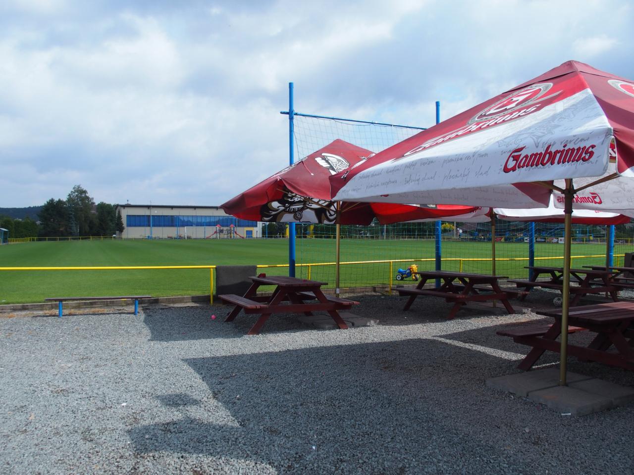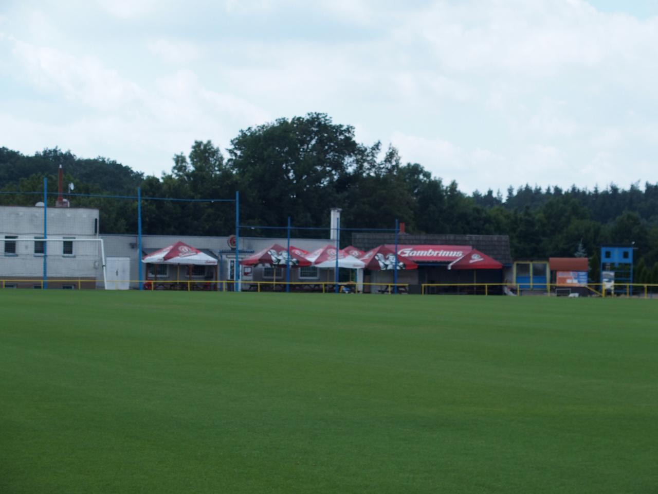Travnaté fotbalové hřiště s kabinami, restaurací Na hřišti