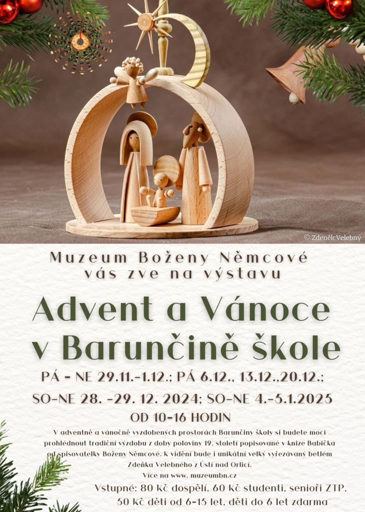 Vstupné 80 Kč dospělí, 60 Kč studenti, senioři ZTP, 50 Kč děti od 6–15 let. Komentované prohlídky minimálně každou celou hodinu. Doporučujeme rezervace předem na emailu mbn@ceskaskalice.cz. Ve adventně a vánočně vyzdobených prostorách Barunčiny školy si budete moci prohlédnout tradiční výzdobu z doby poloviny 19. století popisované v knize Babička od spisovatelky Boženy Němcové. K vidění bude i unikátní velký vyřezávaný betlém Zdeňka Velebného z Ústí nad Orlicí. Více na www.muzeumbn.cz.