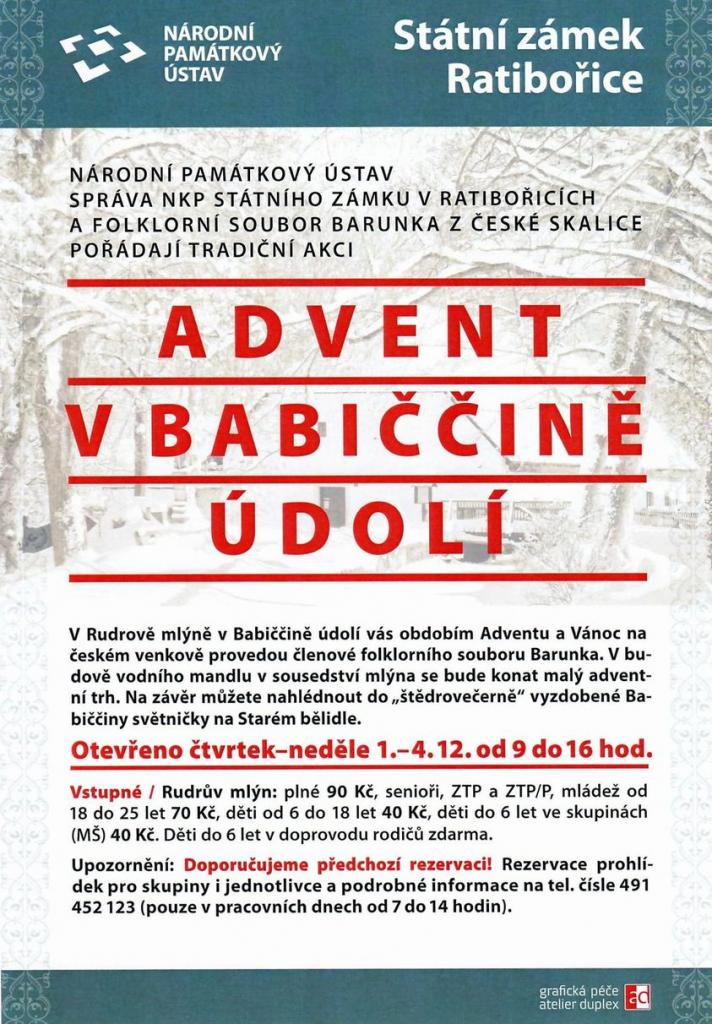 V budově vodního mandlu se bude konat malý adventní trh, kde můžete posedět v hospůdce. Na závěr můžete nahlédnout do štědrovečerně vyzdobené Babiččiny světničky na Starém bělidle. Více informací získáte na tel. 777 347 117 nebo www.barunka.org, Facebook DFS a FS Barunka.