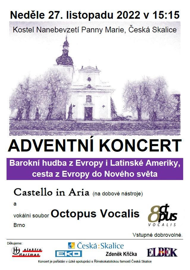 Zveme vás na koncert. Účinkovat bude soubor Castello in Aria na dobové nástroje a vokální ansámbl Octopus Vocalis z Brna. Představí se společným adventním programem Barokní hudba z Evropy i Latinské Ameriky - cesta z Evropy do Nového světa. Zazní české adventní písně a španělské duchovní villancios.