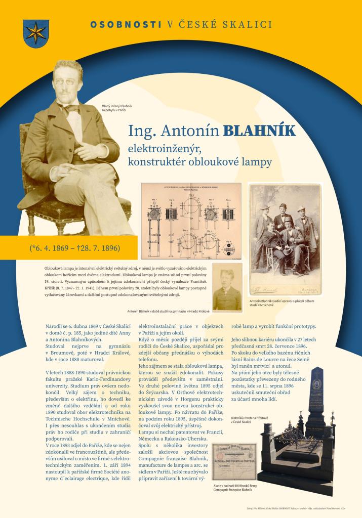 Výstava věnovaná českoskalickému rodákovi Antonínu Blahníkovi, vynálezci elektrické obloukové lampy, výstava připomínající osobnost Antonína Blahníka, od jehož úmrtí uplyne 130 let.