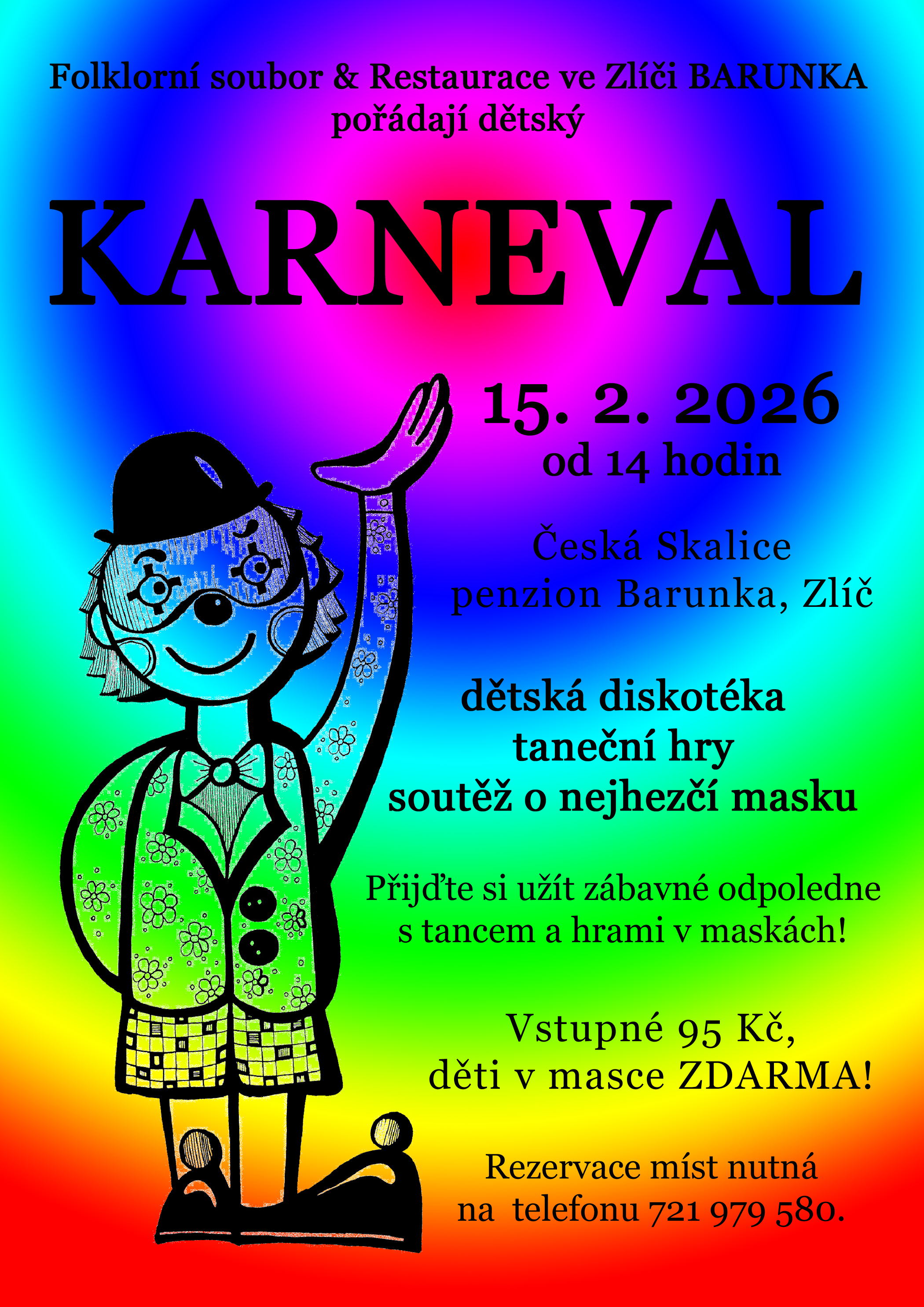 Pořádá Folklorní soubor Barunka Restaurace Barunka Zlíč. Připravena bude dětská diskotéka, taneční hry a soutěž o nejhezčí masku. Přijďte si užít zábavné odpoledne s tance a hrami v maskách. Vstupné 95 Kč, děti v masce zdarma. Rezervace míst nutná na telefonu 721 979 580.