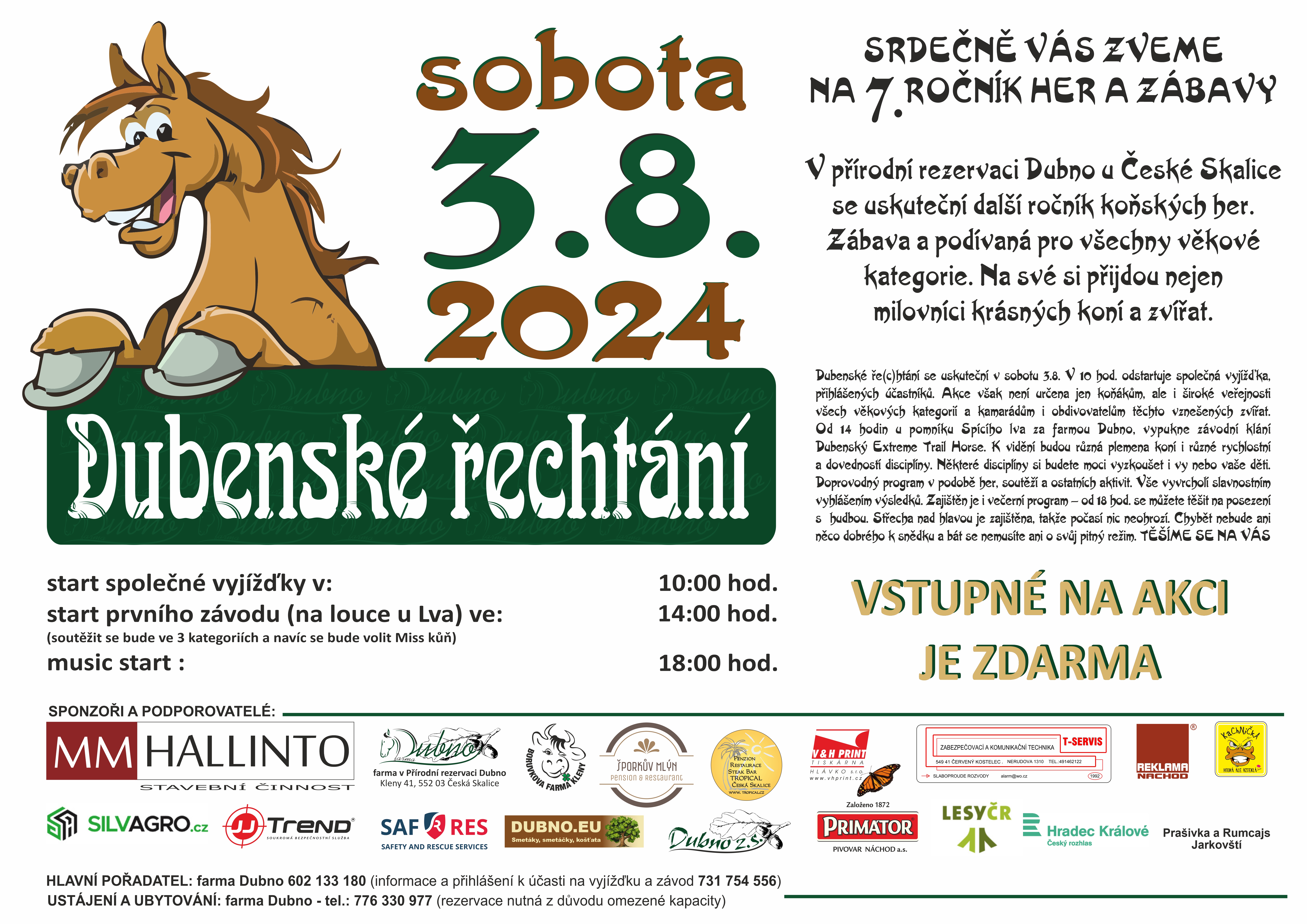 Akce však není určena jen koňákům, ale i široké veřejnosti všech věkových kategorií a kamarádům i obdivovatelům těchto vznešených zvířat. K vidění jsou různá plemena koní z celé České republiky i různé rychlostní a dovedností disciplíny. Některé disciplíny si můžete moci vyzkoušet i vy nebo vaše děti. Střecha nad hlavou je vždy zajištěna, takže počasí nic neohrozí. Nechybí ani něco dobrého k snědku a bát se nemusíte ani o svůj pitný režim. Více informací https://www.dubnozs.cz/akce1/dubenske-rechtani