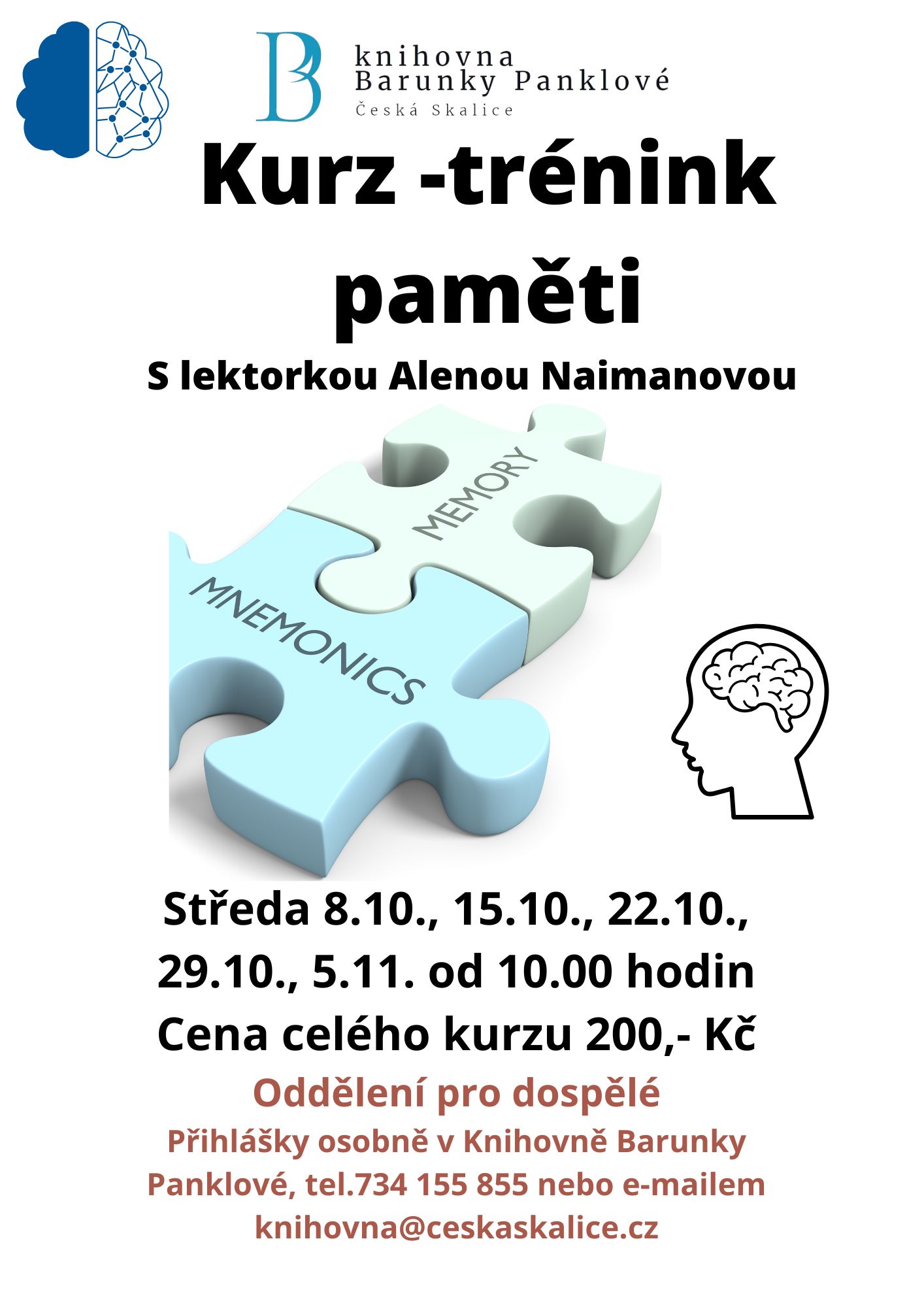 Čekají vás praktická cvičení na podporu paměti a soustředění, tipy a techniky, jak si lépe pamatovat důležité informace, zábavné hry a úkoly v přátelské atmosféře, sdílení zkušeností a příjemné setkání s ostatními. Cena za celý kurz 200 Kč. Přihlášky osobně nebo na čísle 734 155 855.