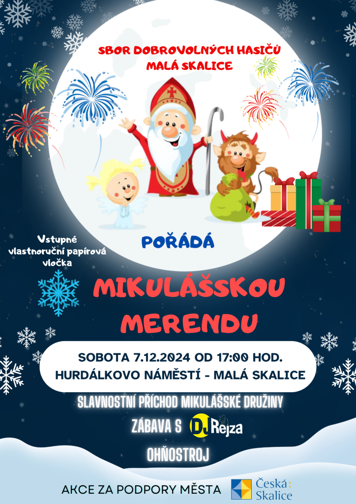 Sbor dobrovolných hasičů pořádá tradiční akci. Připraven bude slavnostní příchod mikulášské družiny, zábava s DJ Rejzou a ohňostroj. Jako vstupné poslouží vlastnoručně vyrobená papírová vločka. Akce se koná za podpory města Česká Skalice.