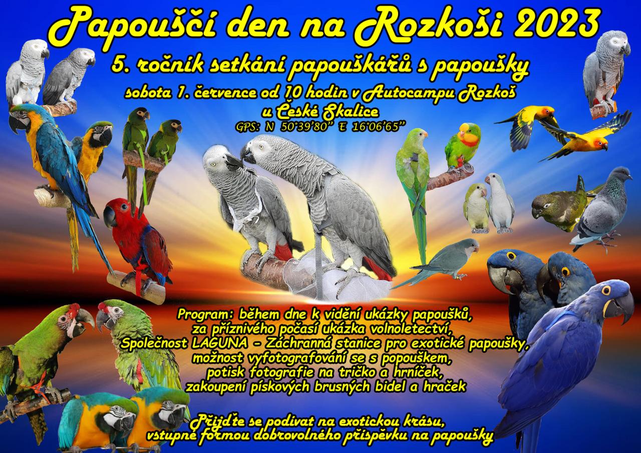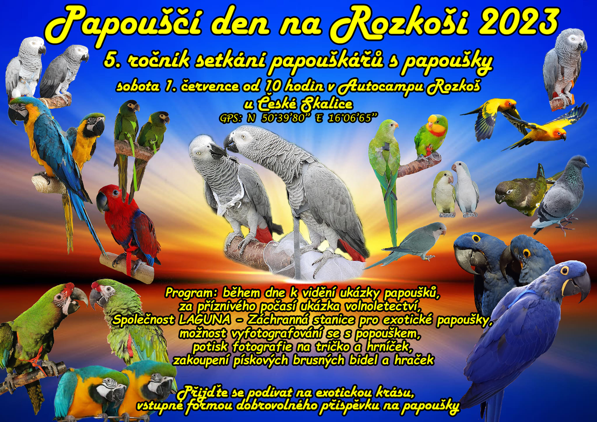 Představí se zde společnost Laguna, záchranná stanice pro exotické papoušky. Možnost vyfotografování se s papouškem. Potisk na tričko a hrníček. Prodej pískových brusných bidel a hraček pro papoušky. Přijďte se podívat na exotickou krásu. Dobrovolný příspěvek ze vstupného bude určený pro papoušky.