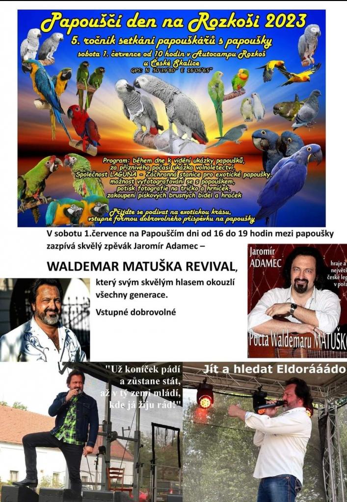V sobotu 1. července od 16 do 19 hodin Papouščí den zpestří vystoupení skvělého zpěváka Jaromíra Adamce a WALDEMAR MATUŠKA REVIVALU.