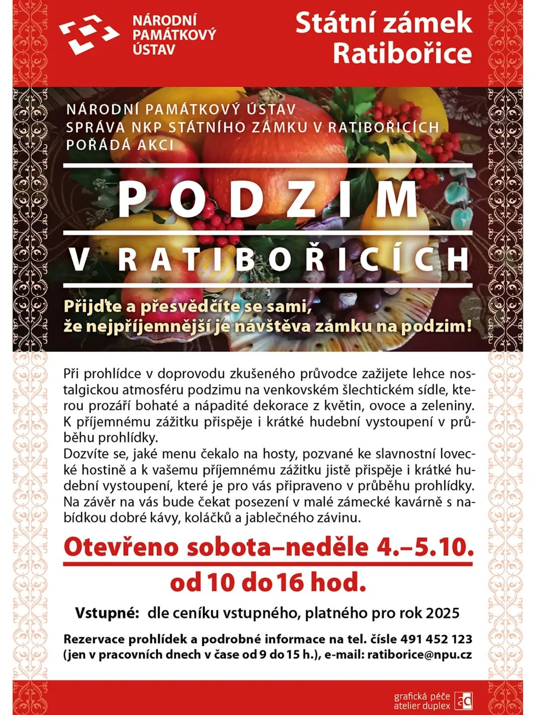 Podrobné informace o programu, cenách vstupenek, rezervací atd. naleznete na adrese www.zamek-ratiborice.cz. Informace podáváme též telefonicky v pracovních dnech v čase od 9 do 14 hodin na tel. 491 452 123.