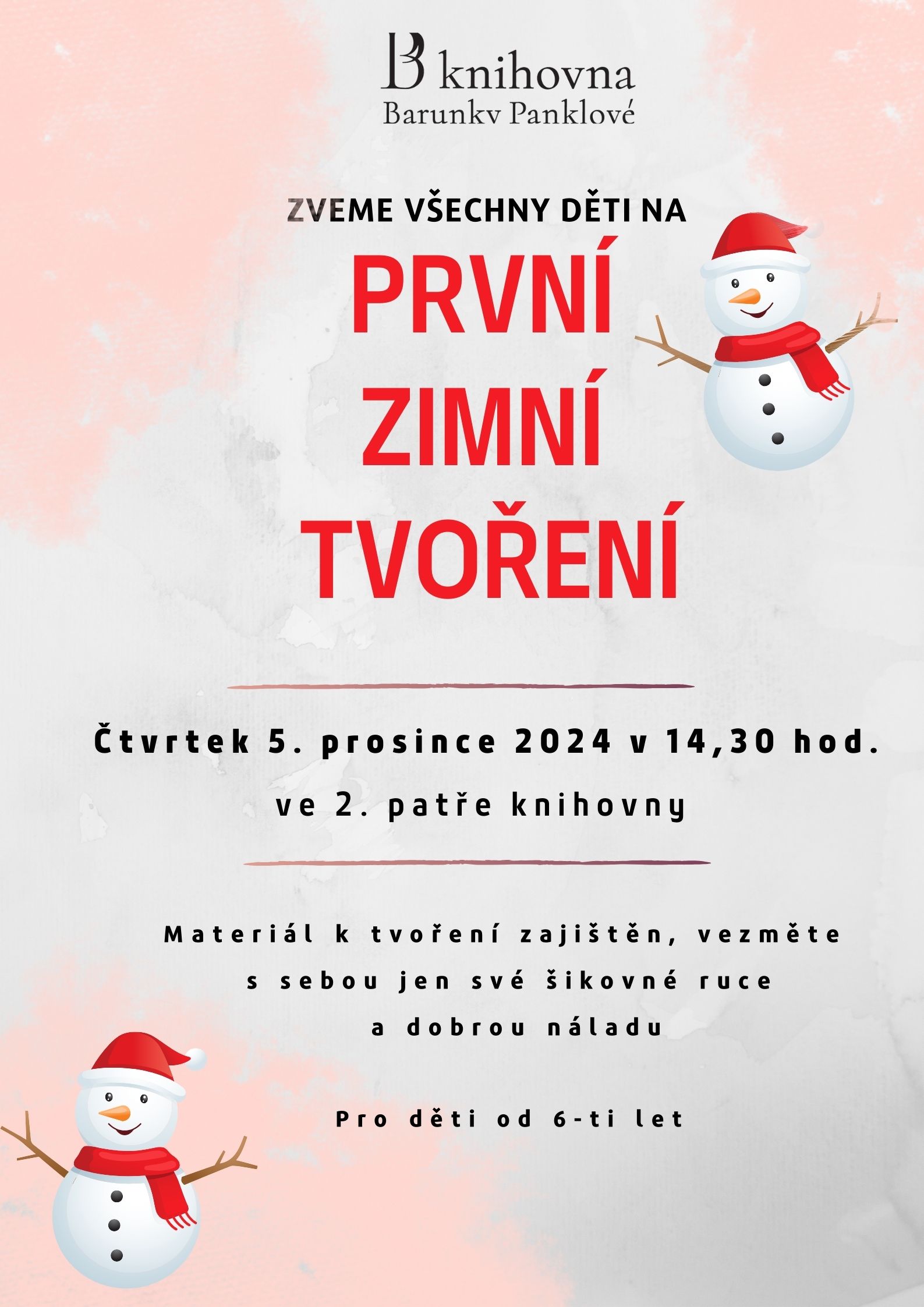 Zveme všechny šikovné děti od 6 let na pravidelné Tvoření s Lídou a Radkou, tentokrát na zimní a vánoční téma. Během akce si malí účastníci vyrobí několik zajímavých věcí a pobaví se. Materiál zajištěn, stačí jen šikovné ruce a dobrá nálada.