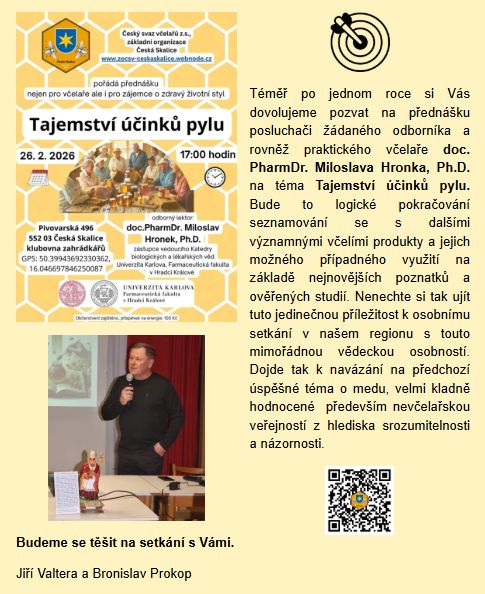 ... Farmaceutické fakulty v Hradci Králové. Zveme na přednášku posluchači žádaného odborníka a rovněž praktického včelaře. Bude to pokračování seznamování se s dalšími významnými včelími produkty a jejich možným využitím na základě nejnovějších poznatků. Nenechte si ujít tuto jedinečnou příležitost k osobnímu setkání s touto vědeckou osobností. Dojde tak k navázání na předchozí úspěšnou přednášku o medu, kterou velmi kladně hodnotila také „nevčelařská“ veřejnost díky srozumitelnosti a názornosti. Občerstvení zajištěno. Příspěvek na energie 100 Kč.