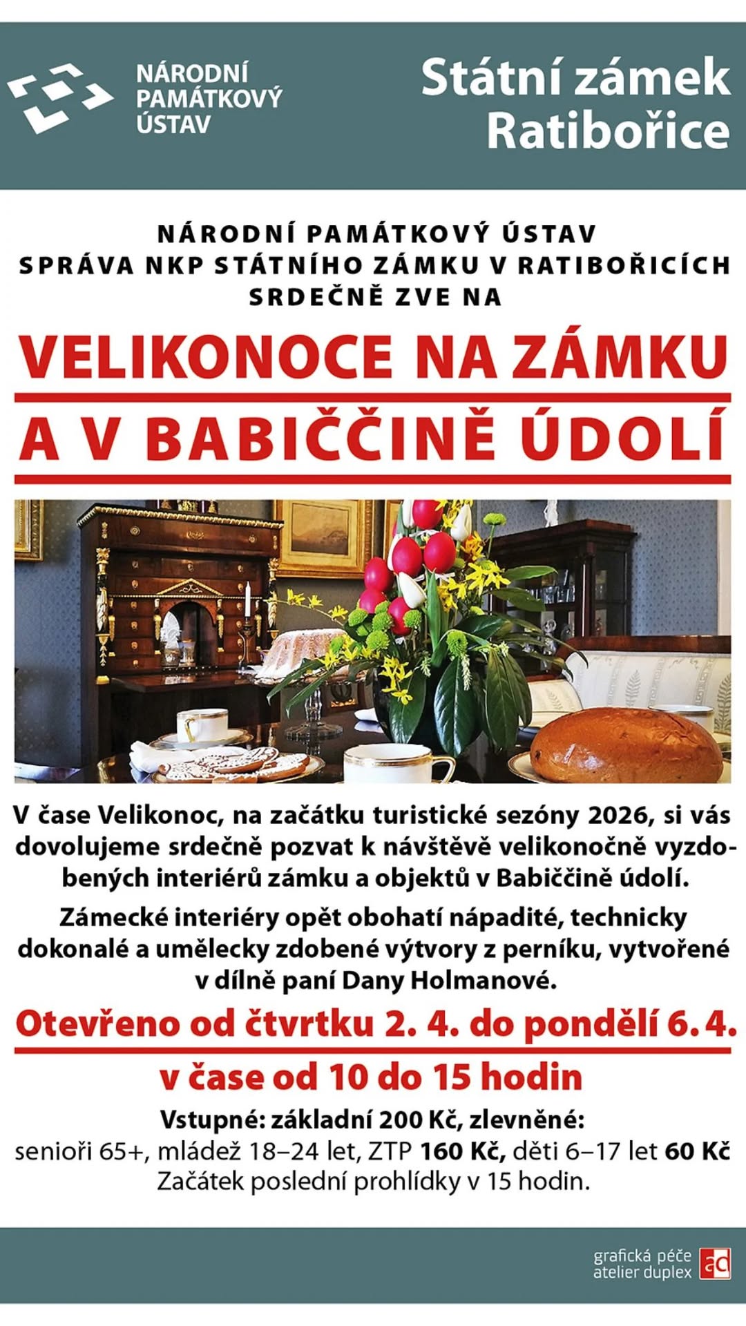 Interiéry zámku budou při této příležitosti opět doplněny, umělecky i technicky dokonale provedenými výtvory, zhotovenými tradičními postupy z voňavého perníku paní Danou Holmanovou. Podrobné informace o všech programech, cenách vstupenek, rezervacích atd. naleznete na adrese www.zamek-ratiborice.cz. Informace podáváme rovněž telefonicky v pracovních dnech v čase od 8 do 15 hodin, tel. 491 452 123.