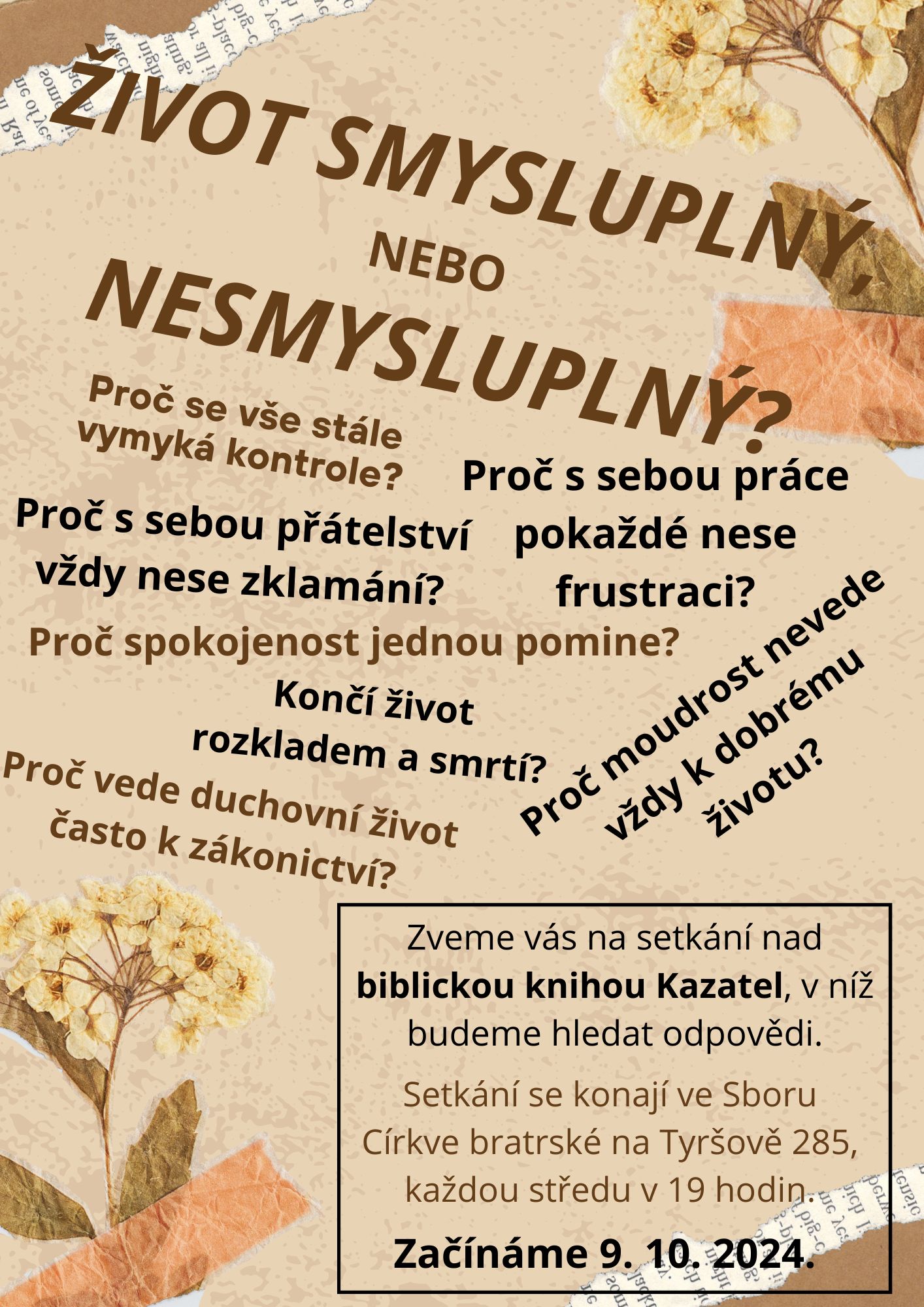 Zveme vás na setkání nad biblickou knihou Kazatel, v níž budeme hledat odpovědi.