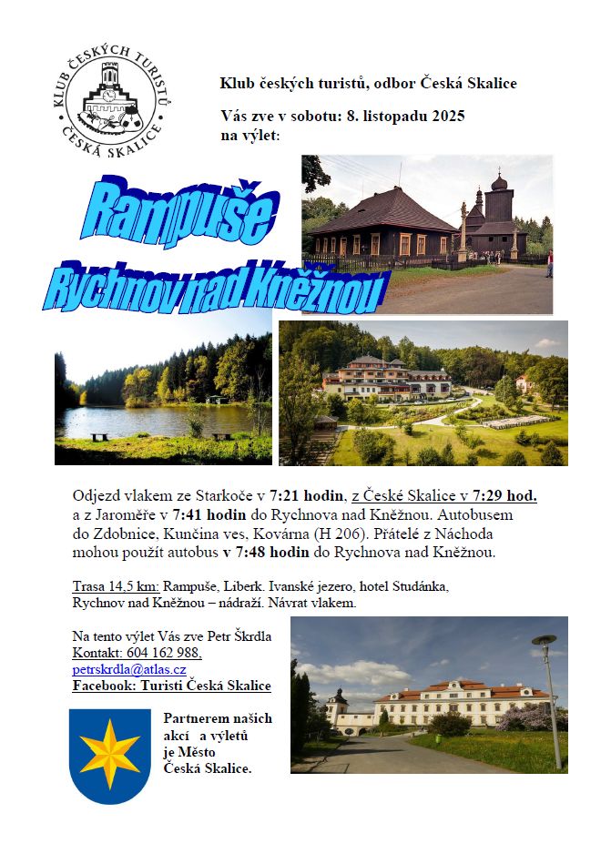 Vede Petr Škrdla. Odjezd vlakem z České Skalice v 7.29 hodin přes Hradec Králové a Týniště nad Orlicí do Rychnova nad Kněžnou. Autobusem do Zdobnice, Kunčina ves, Kovárna. Trasa 14,5 km: Rampuše, Liberk, Ivanské jezero, hotel Studánka, Rychnov nad Kněžnou – nádraží. Návrat vlakem. Kontakt: 604 162 988, mail petrskrdla@atlas.cz.
