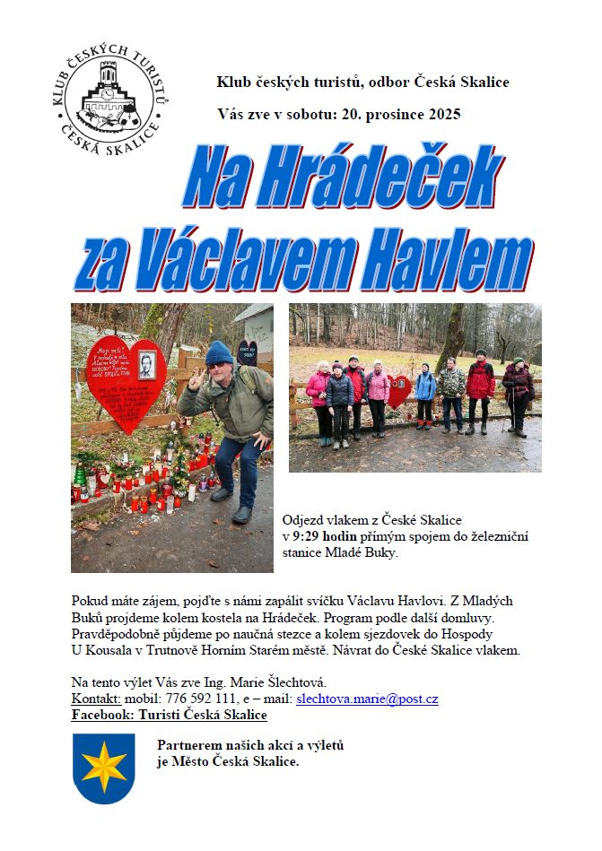 Vede Marie Šlechtová. Pokud máte zájem, pojďte s námi zapálit svíčku Václavu Havlovi. Program podle další domluvy. Odjezd vlakem z České Skalice v 9.29 hodin přímým spojem do Mladých buků. Pokud máte zájem, pojďte s námi zapálit svíčku Václavu Havlovi. Z Mladých Buků projdeme kolem kostela na Hrádeček. Další program dle domluvy, pravděpodobně půjdeme kolem sjezdovek do Horního Starého města do hospody U kousala. Návrat vlakem. Kontakt: tel. 776 592 111, mail slechtova.marie@post.cz.